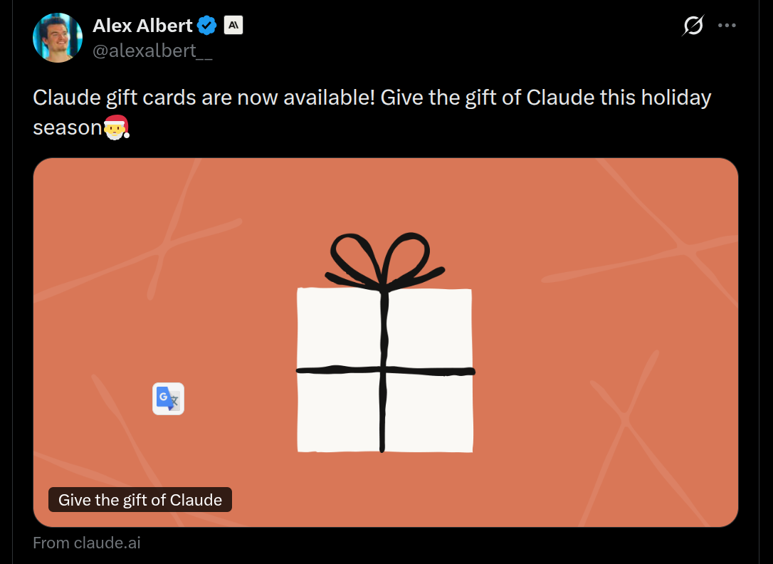 As the world enters the holiday season, Anthropic has officially announced its Claude gift cards, enabling people to give their loved ones exciting Claude plans to celebrate the joyous season.
