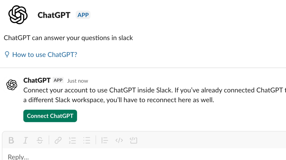 - Your Slack workspace must allow installation of the ChatGPT app for Slack