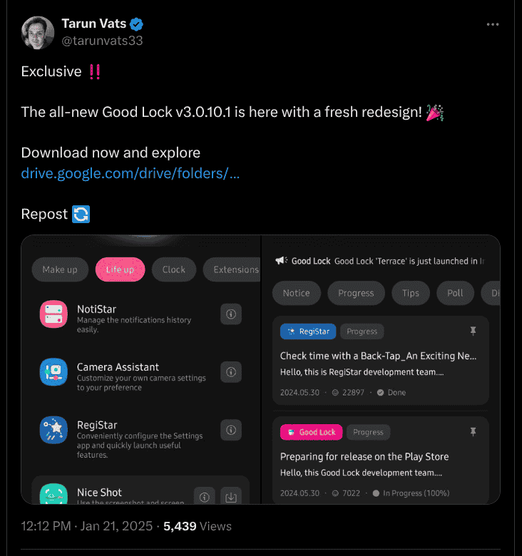 As per what has been shared (via @tarunvats), the software suite/app on Samsung Galaxy devices that lets users customize the user interface with the help of many tools and features – Good Lock has received a new version update. The latest 3.0.10.1 version is now available for download, and this version brings a refreshed design when compared to the previous version.