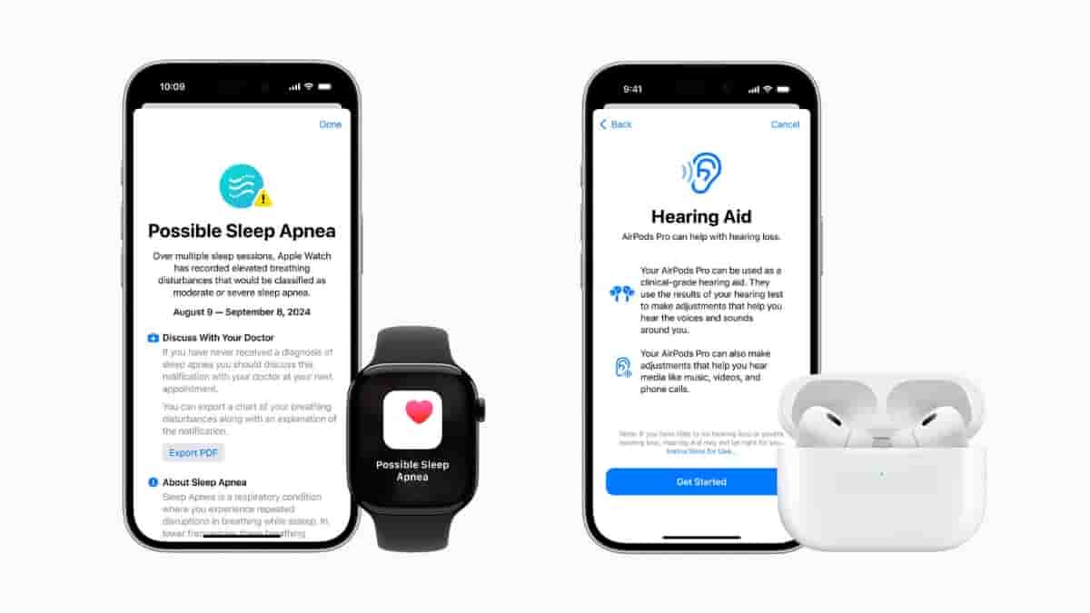Hearing Test and Hearing Aid features on AirPods Pro 2 and Sleep Apnea notifications are now available on Apple Watch in selected regions