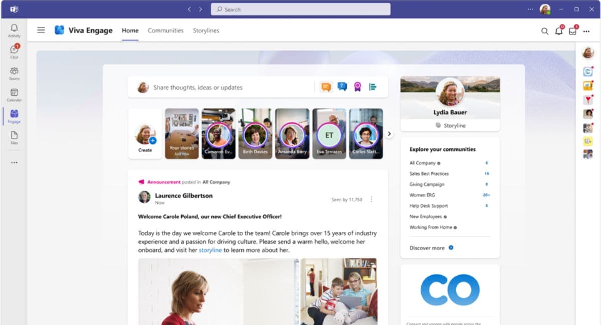 While Yammer often feels like an extension of SharePoint and Office, Viva Engage looks like a replication of Facebook. It consists of a storylines section, which is effectively your Facebook news feed, featuring conversational posts, videos, images, and more.