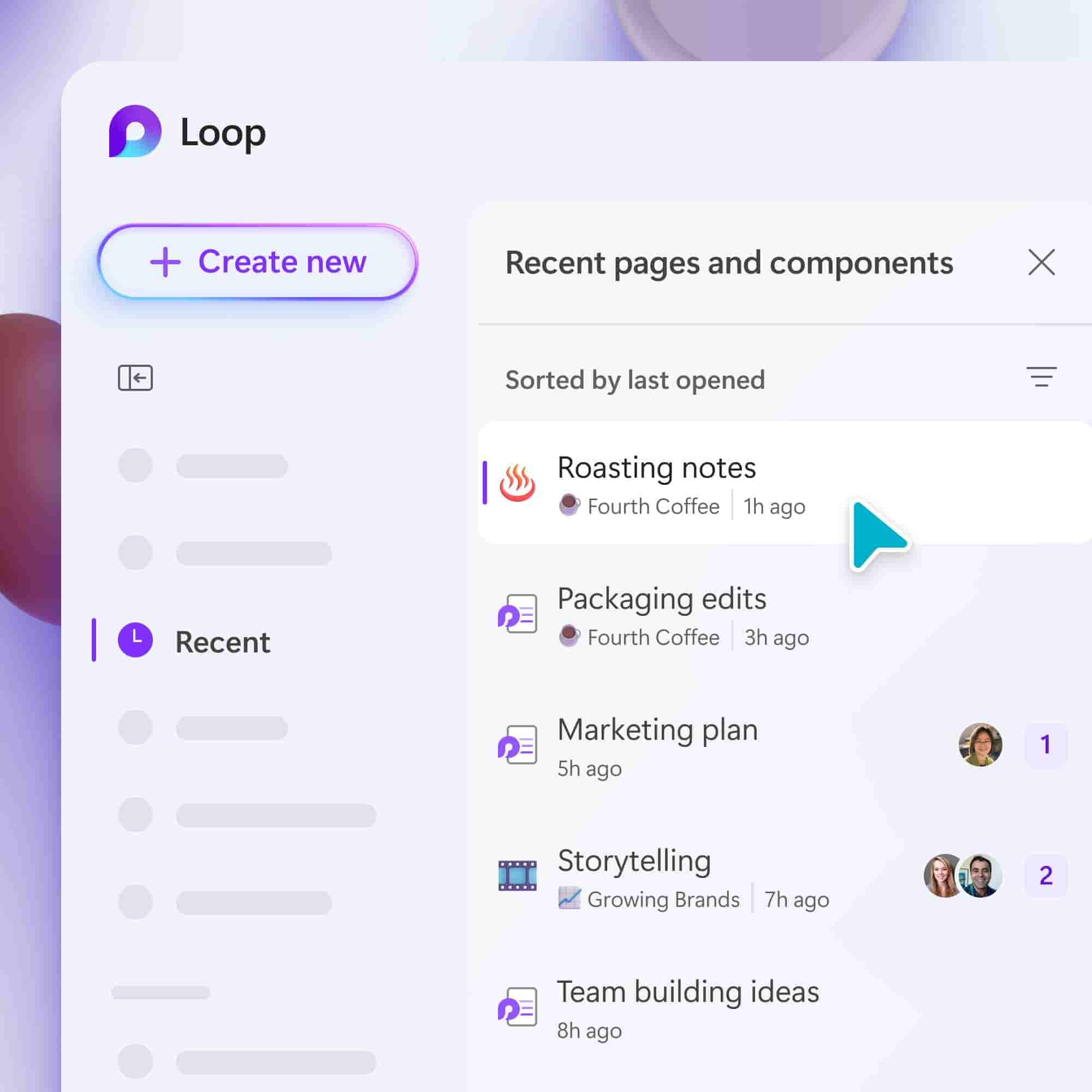 - Recent Tab- Easily find your most recent Loop pages and components across Microsoft 365 in the improved Recents tab. It will even show you Loop components you created directly in Microsoft Teams, Outlook, MS One Note, and Whiteboard.