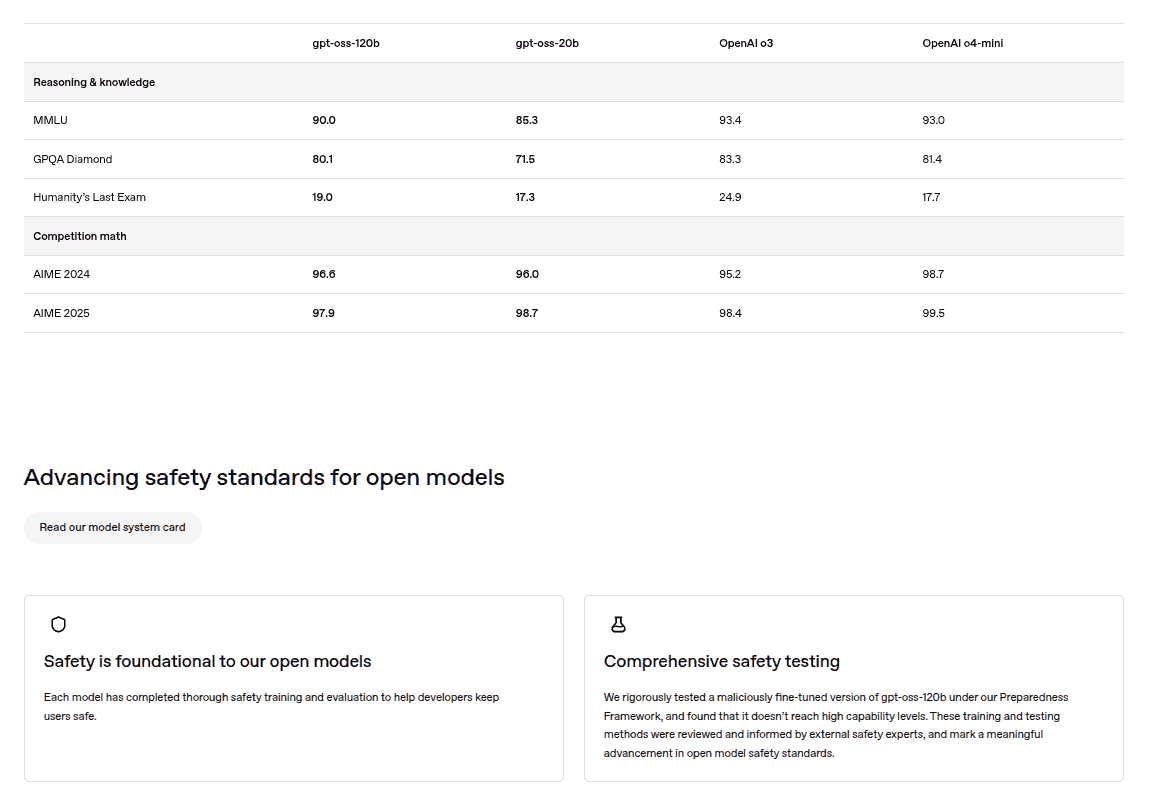 Regarding their performance, while mostly lower when compared to the OpenAI o3 and OpenAI o4-mini models, the gpt-oss-120b and gpt-oss-20b did perform well on reasoning & knowledge and competition math benchmarks tests. Also, in terms of security, the two models have undergone safety testing and evaluation, and are revealed to keep its users safe.