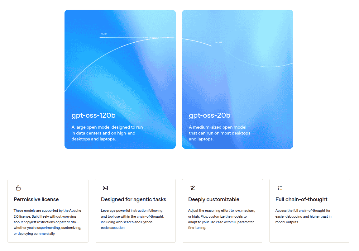 As mentioned, two new open-weight models have been introduced by OpenAI and these include the ‘gpt-oss-120b’ and ‘gpt-oss-20b’ models. The former is a large open model that is designed for use in data centers as well as on high-end laptops and desktops, whereas the latter is a medium-sized open model that has been designed for most laptops and desktops. Both the models are also supported by the Apache 2.0 license, which enables users to create freely without any copyleft issues or patent restrictions. Moreover, the two models are designed for agentic tasks and they are deeply customizable with low/medium/high reasoning adjustments. Users can also easily access the full chain of thoughts too.