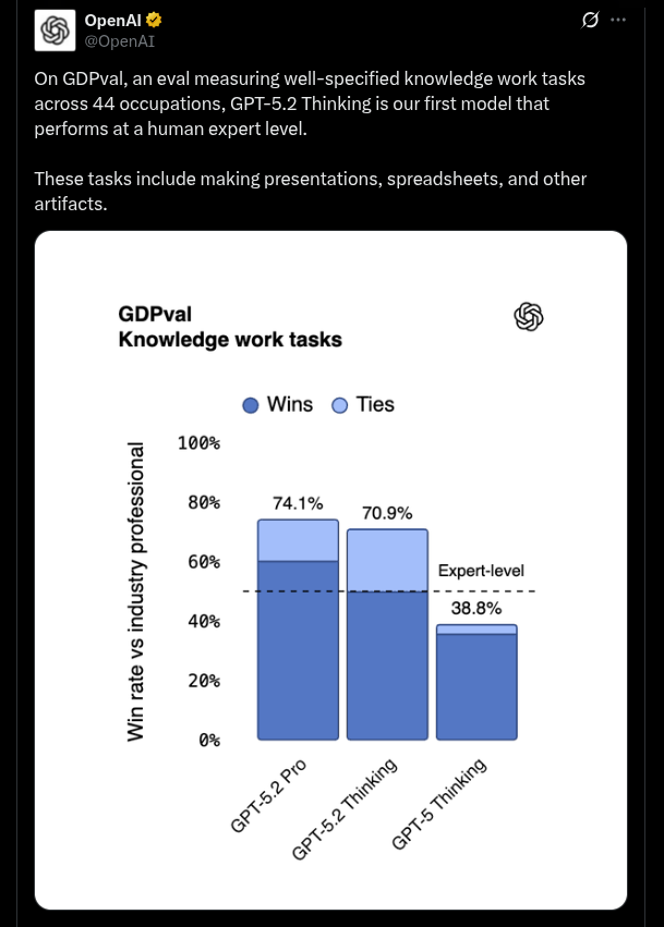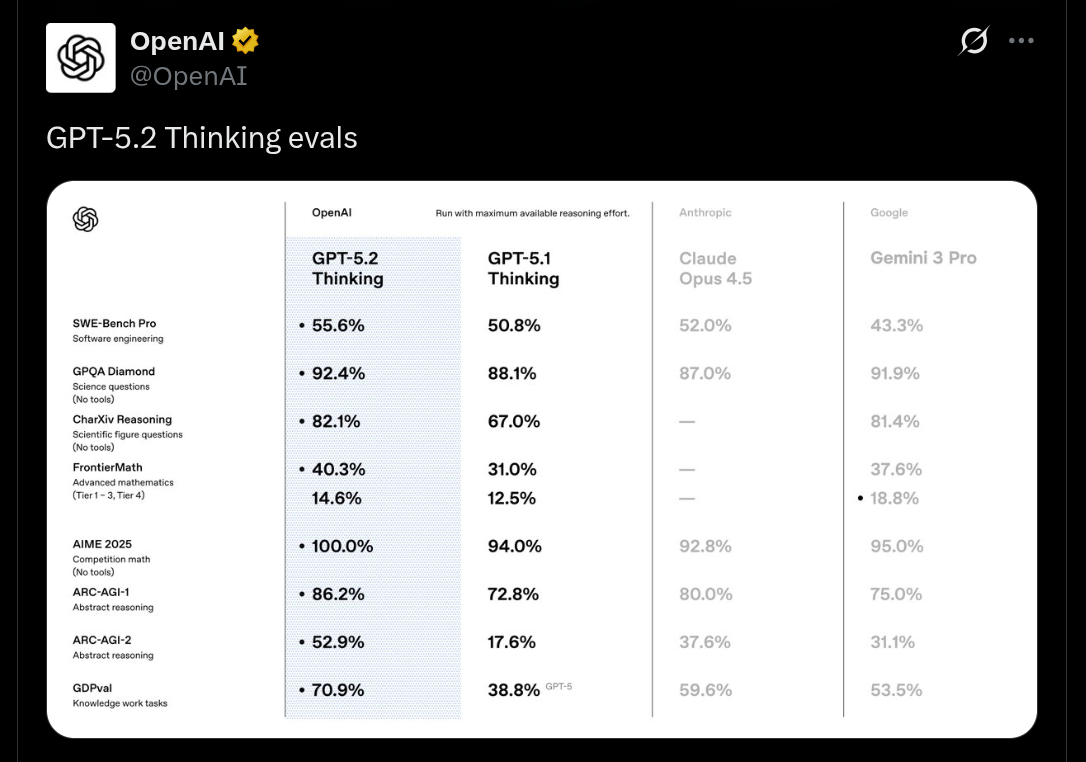 In terms of performance, when compared to the previous GPT-5.1 (Thinking version), the GPT-5.2 (Thinking version) has attained higher performance scores on the SWE-Bench Pro (55.6%), GPQA Diamond (92.4%), CharXiv Reasoning (82.1%), FrontierMath (40.3%; 14.6%), AIME 2025 (100.0%), ARC-AGI-1 (86.2%), ARC-AGI-2 (52.9%), and GDPval (70.9%) benchmarks. Speaking more, on the GDPval benchmark, the GPT-5.2 (Thinking version) has become the very first model to perform at human expert level in tasks like making presentations, spreadsheets, and more.