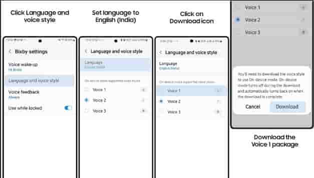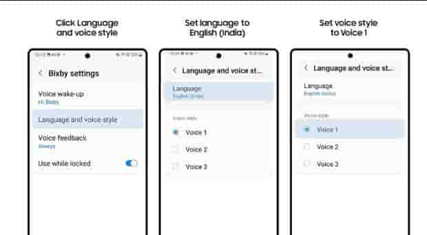 - Users can use Voice 1 by setting the language to “English(India)”& the voice style to “Voice1.” Go to Bixby settings>Language and voice style