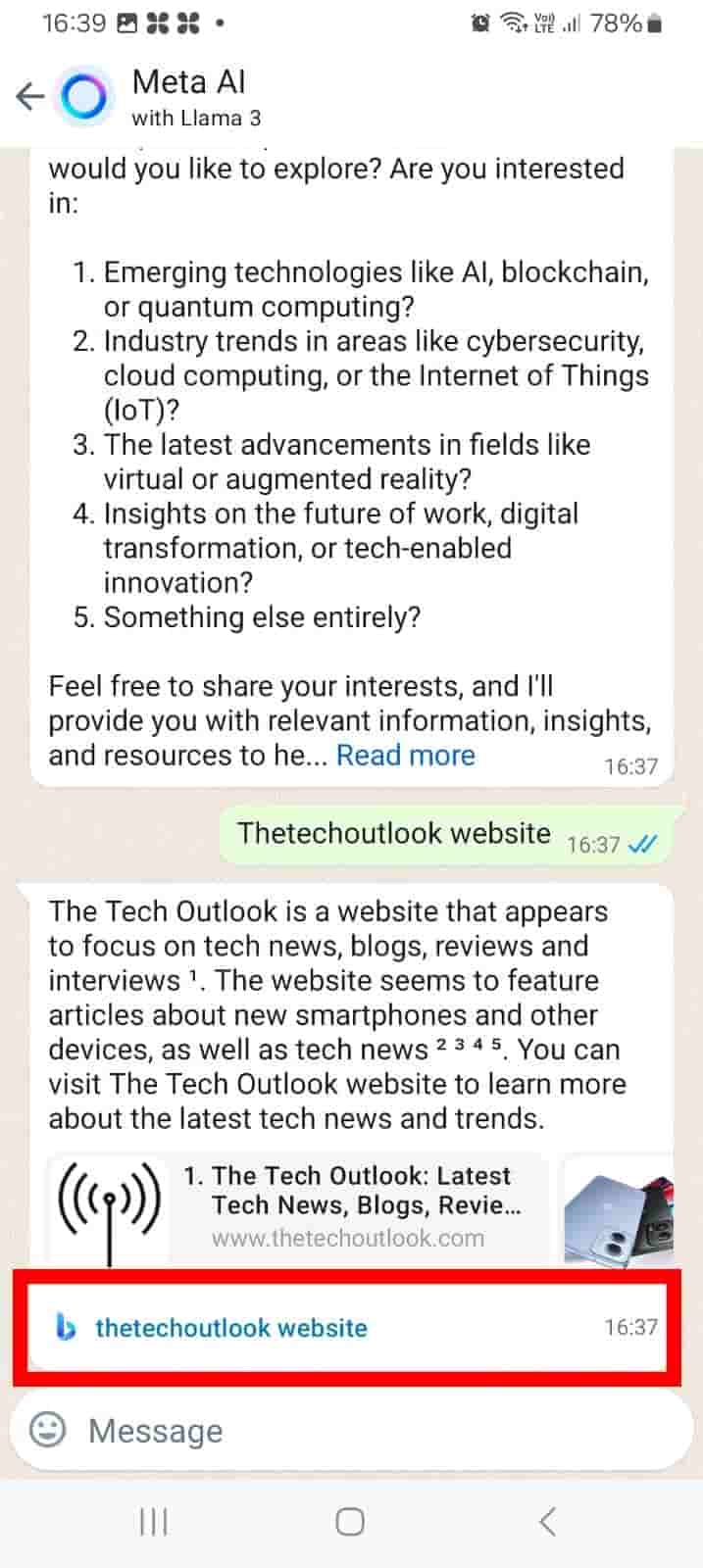Users can head to the Chat option on WhatsApp, and once you click on the top search bar you get the option to ask Meta AI anything as showcased in the above image. Or you can directly click on the Meta AI icon ring to initiate a chat with the Meta AI chatbot. On using this newly rolled out feature on the device we found out that Meta AI is using Microsoft Bing Search to answer the queries of users.