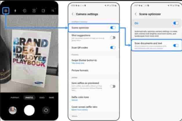 Enable all document scan-associated features, turn on ‘Scene optimizer’ and ‘scan documents and text’