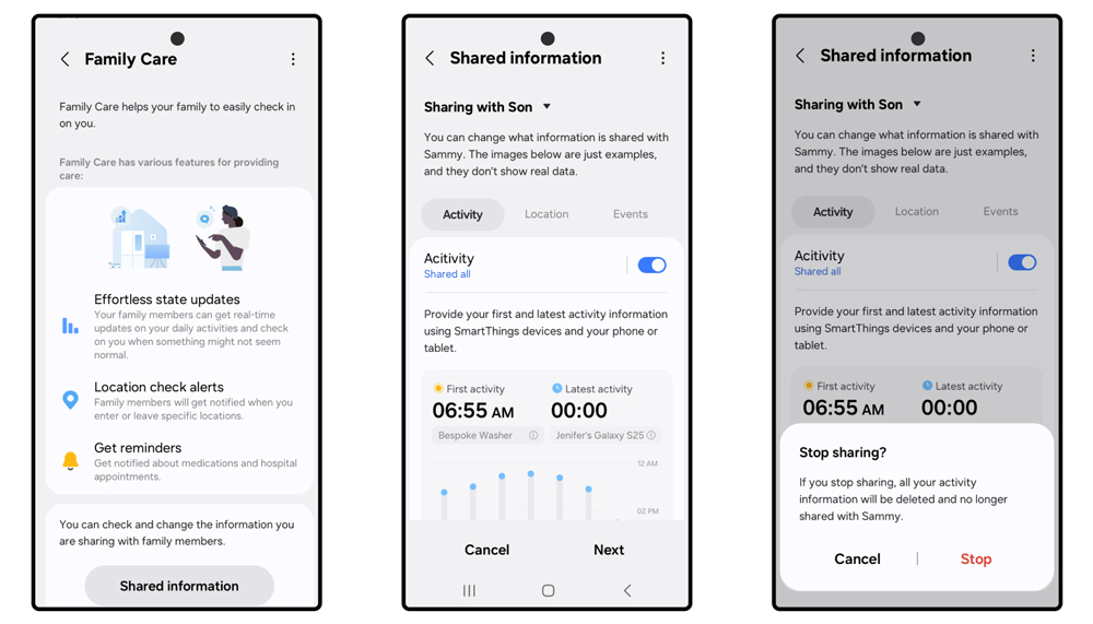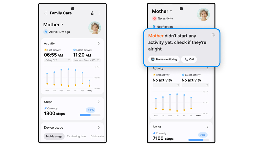 If care recipients use the Samsung Health app, caregivers can also view details such as wake-up times, bedtimes and daily step counts, enabling a more proactive approach to health management.