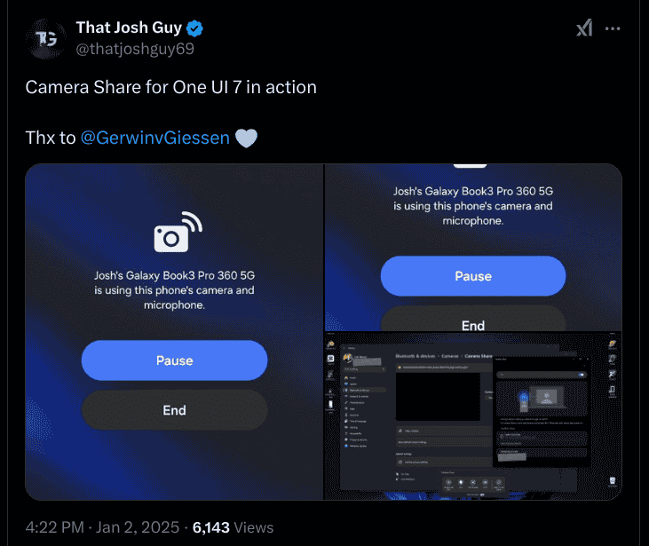 The new Camera Share feature for Galaxy Book laptops that is coming with the brand’s latest One UI 7 custom skin based on the Android 15 operating system is now in action, revealing how it looks in appearance and suggesting the other tools and features that can be accessed.