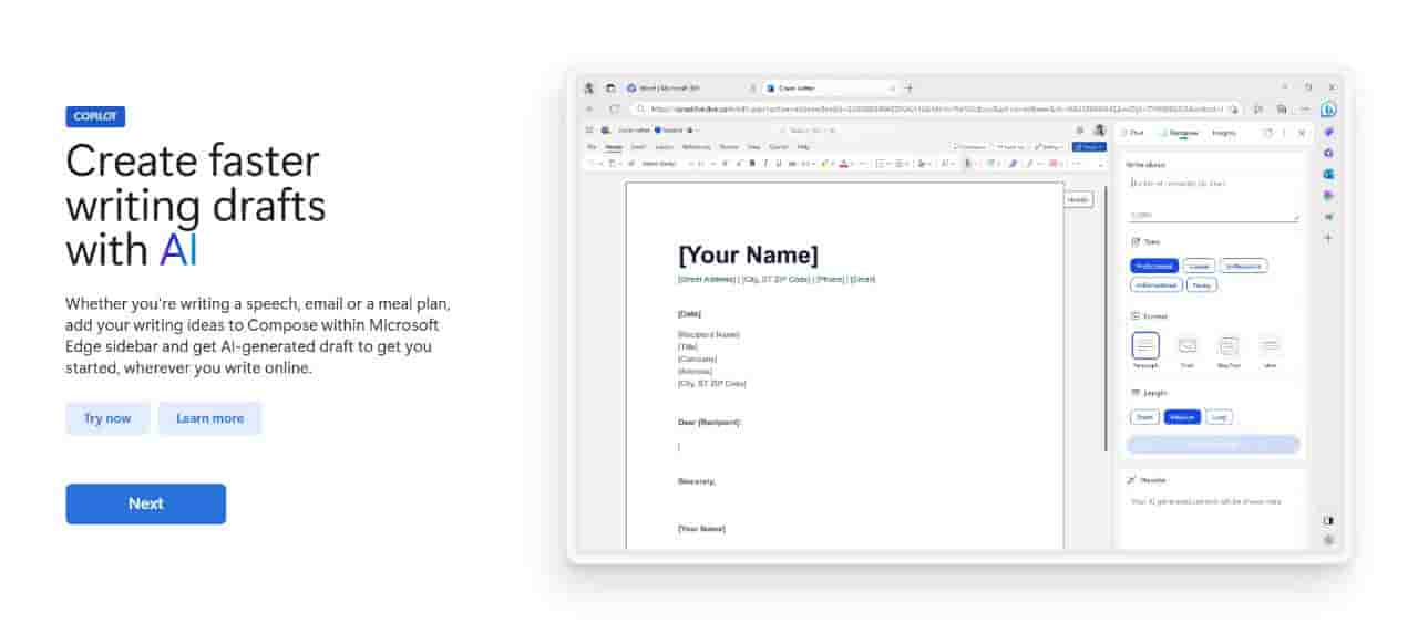 In case you are writing a mail, blog post, or a para for an article or report and are short of ideas this feature can help you to frame it as you want. Once again you just need to tap on the Copilot icon on the side and go with the “compose”. This will bring you a short box where you can tell in a few words about the content that you want to write. It’s more like giving a prompt to a bot and thereafter you need to specify a few things including tone, format, and length. As soon as you click on “Generate Draft” a preview appears to you in a box that you can simply paste wherever you want.