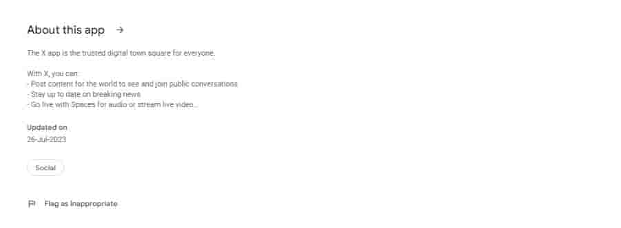 Twitter has updated its Android app by replacing the Blue Bird logo with a new logo and name as part of the rebranding of Twitter. The ‘X’ is the new name and logo for the app right now. The app’s description is updated to “The X app is the trusted digital town square for everyone”.