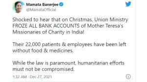 Mamta Banerjee also tweeted saying, “Shocked to hear that (at) Christmas, Union Ministry FROZE ALL BANK ACCOUNTS of Mother Teresa’s Missionaries of Charity in India!”