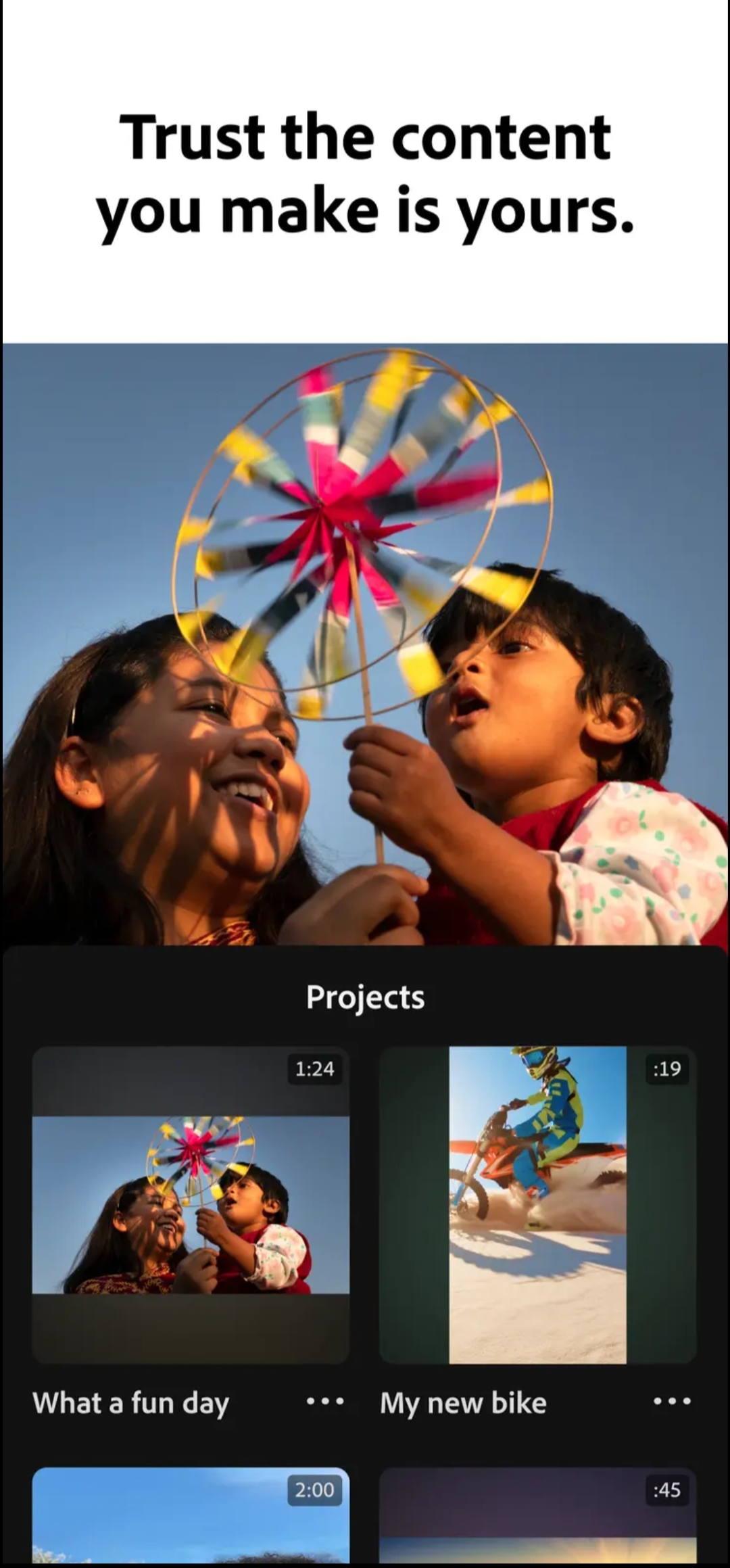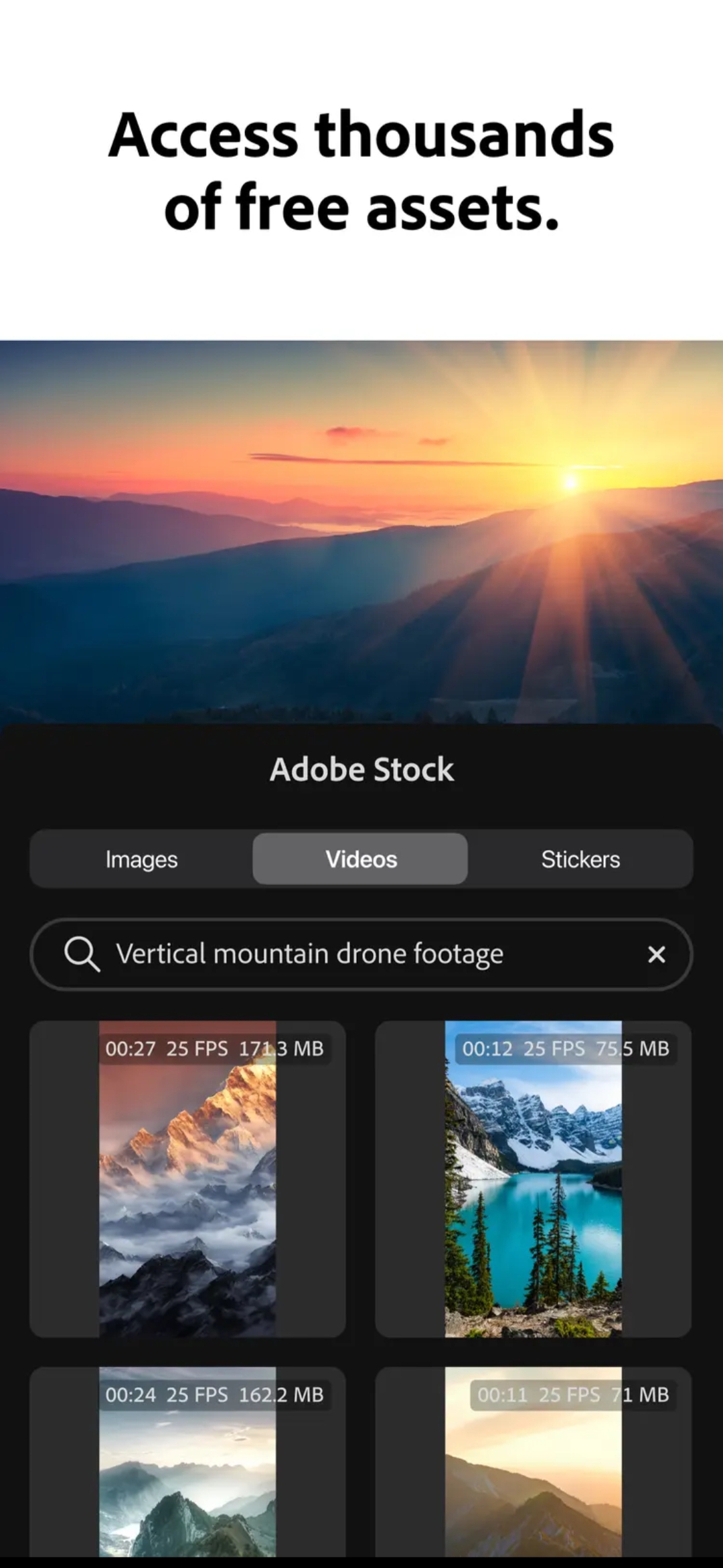 - With Adobe Firefly built in, you have access to all the video, image, and audio assets you could need- just describe the image visual, or sound you imagine and confidently generate content. You also have access to millions of free Adobe Stock assets, from music and sound effects to photos, graphics, and videos, plus Adobe Fonts and Lightroom presets. Add text, music, images, b-roll, and captions with just a few taps.