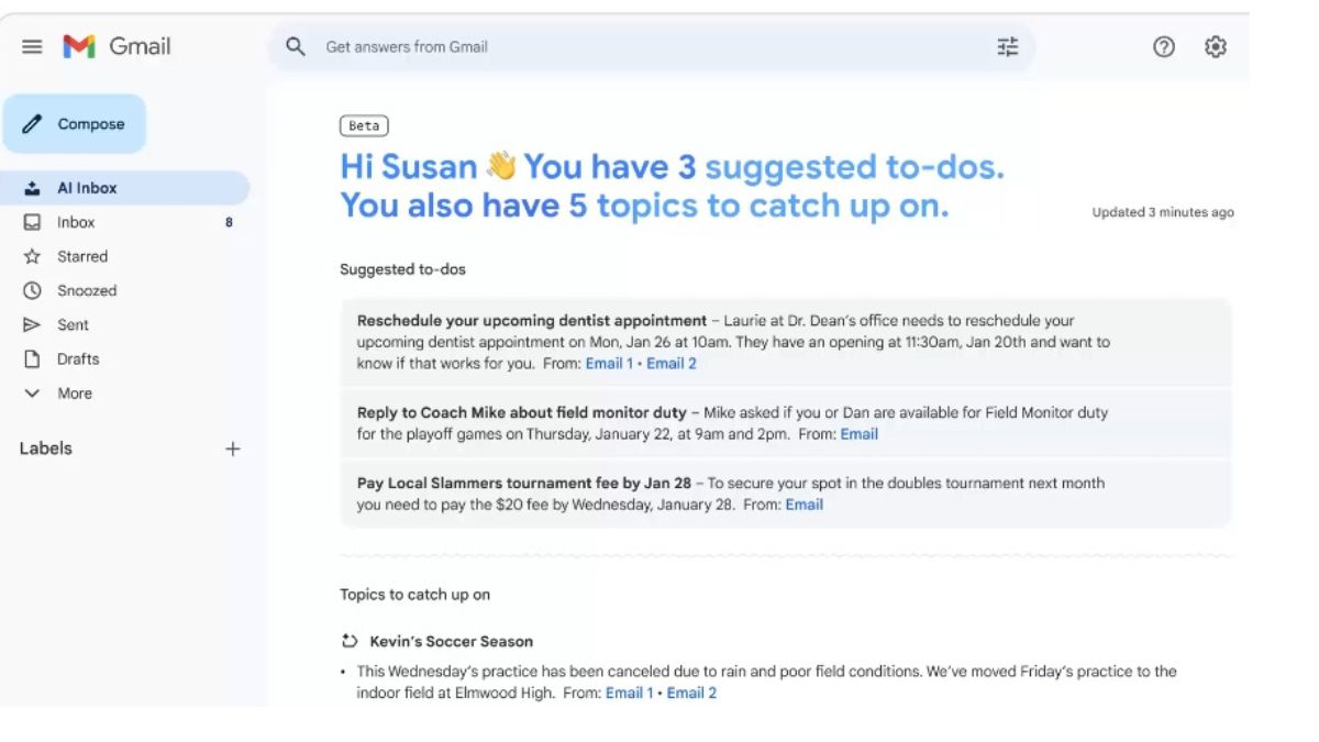 AI Inbox is like having a personalised briefing, highlighting to-dos and catching you up on what matters. It helps users prioritise and identify their VIPs based on signals like people they email frequently, those in their contact list and relationships it can infer from message content.