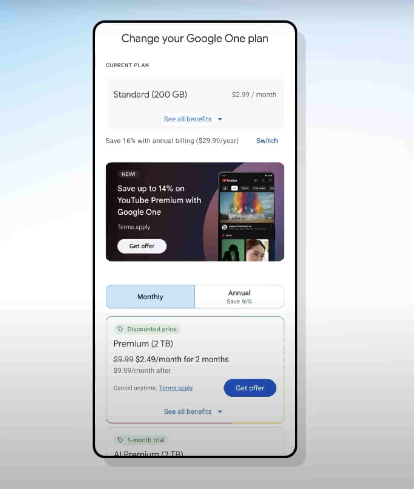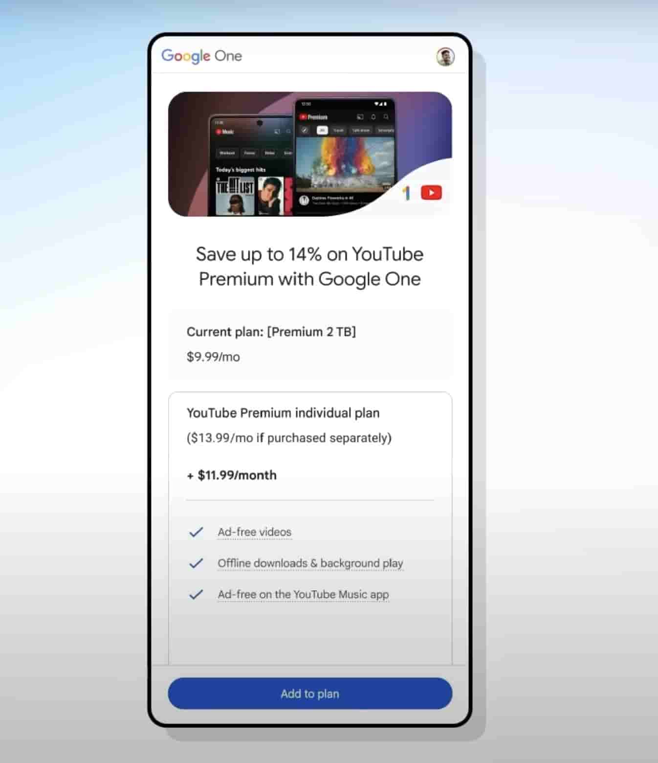 If you already have one of these plans, get the YouTube Premium add-on to your plan. You can save up to 14% on YouTube Premium with Google One as you get $2 per month discount on YouTube Premium individual which costs $13.99 per month.