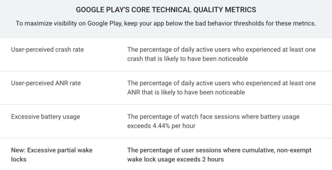 The Android vital metric was co-developed with Samsung, combining their deep, real-world insights into user experience with battery consumption with Android’s platform data, while Google has used app developer input to make the algorithm even more accurate and representative. Google has defined a bad behavior threshold for excessive wake locks. You can check out the Google Play’s Core technical quality metrics below.