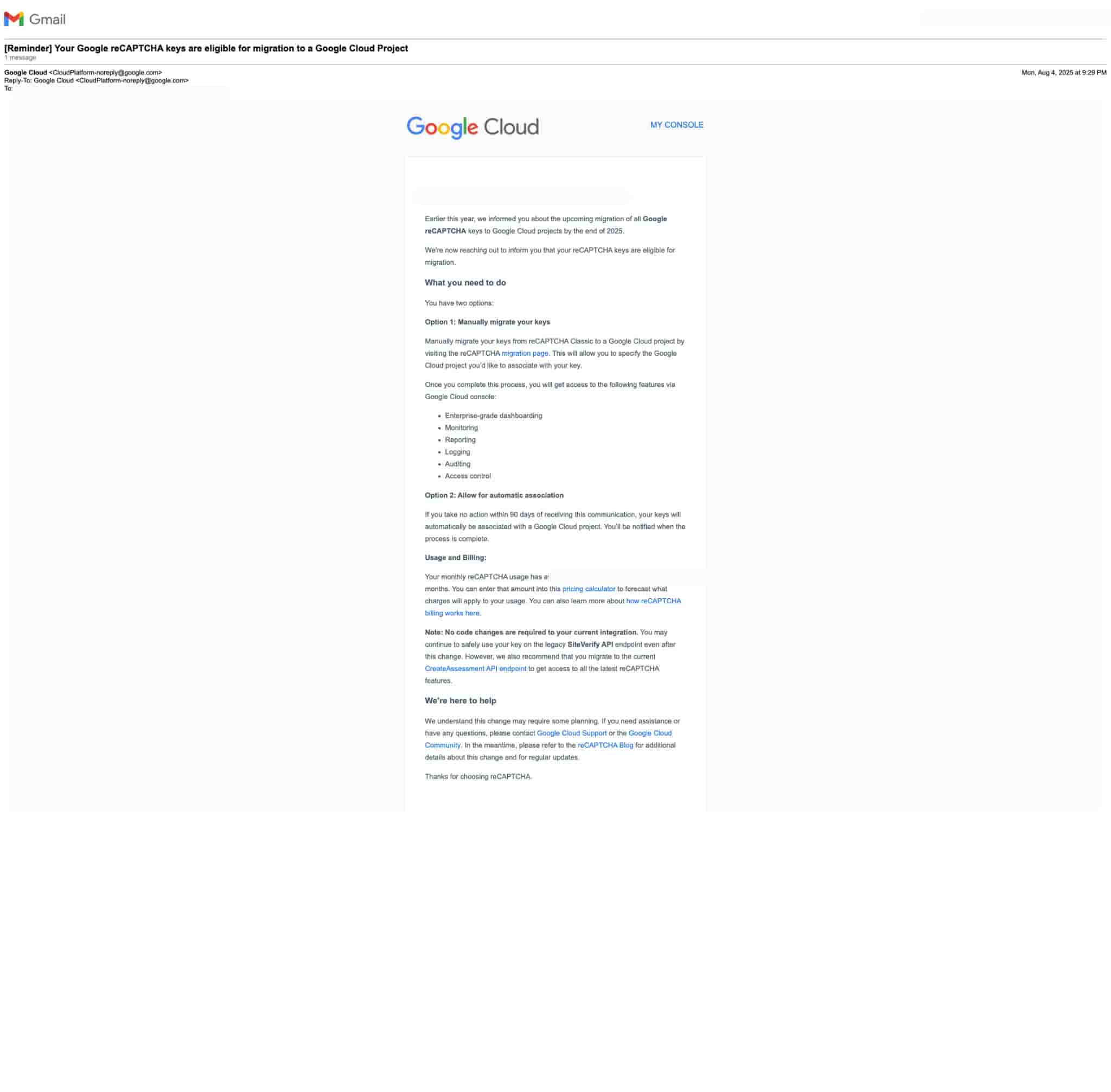 By the end of 2025, all reCAPTCHA keys will belong to a Google Cloud project. You can migrate your keys manually right away, or you can wait and let Google do it automatically 90 days after you receive the migration email. If you migrate manually, you get to choose the Cloud project your keys link to and gain access to extra features like monitoring, reporting, and access controls. If you opt to wait, Google will handle the migration for you and notify you once it’s complete.