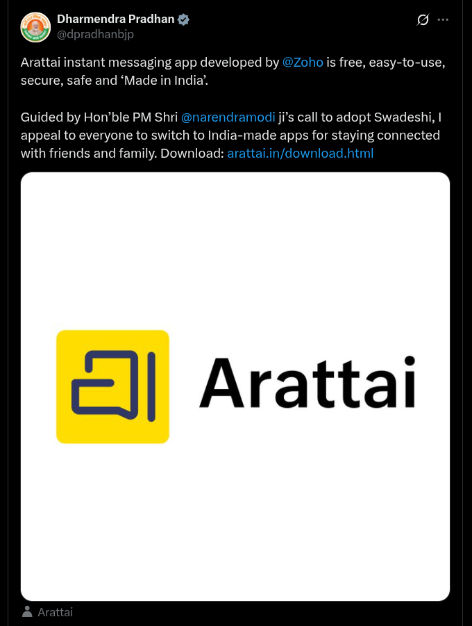 Guided by Narendra Modi’s attempt to make more Indians adopt ‘swadeshi‘, the Union Education Minister – Dharmendra Pradhan via an X post has asked citizens to switch to Arattai (~ ‘India-made apps for staying connected with friends and family). In related news, three days back, Ashwini Vaishnaw (Union Minister of Electronics & Information Technology, Railways, and Information & Broadcasting) had also made a similar announcement on X, stating that he is moving to Zoho for documents, spreadsheets, and presentations.