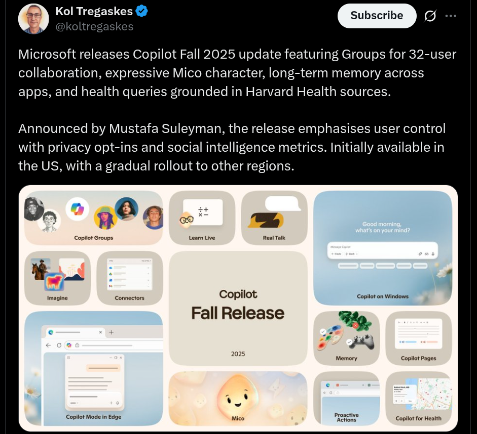 Microsoft Officially Releases its Copilot Fall 2025 Update: Now Available in the US, With Gradual Roll-Out to More Regions Later