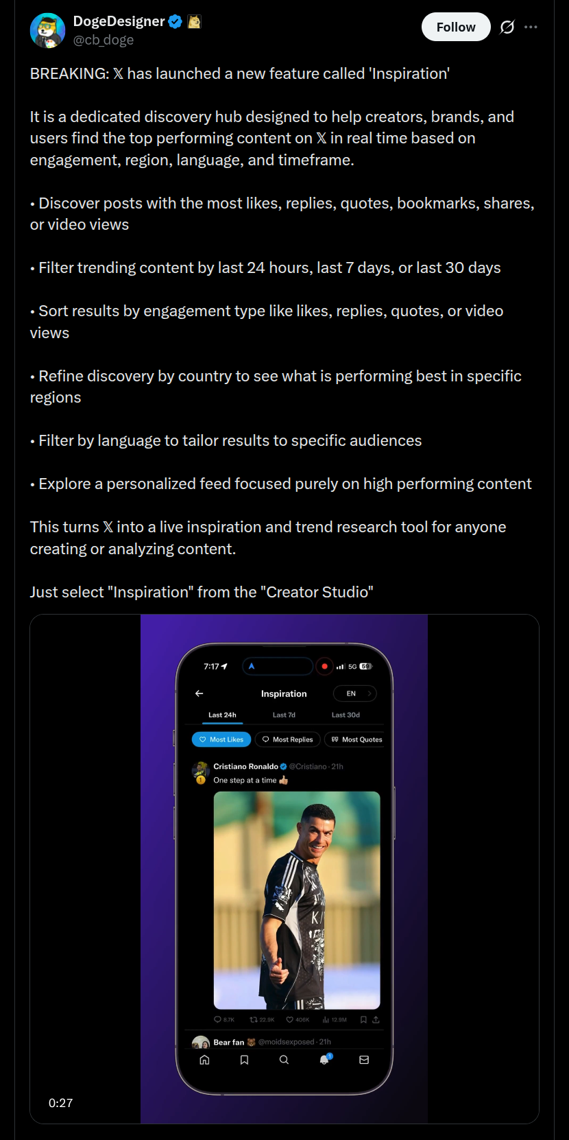 Speaking more, the feature will let its users identify X posts with the most number of likes, replies, quotes, bookmarks, shares, and even video views. Search results can also be sorted with respect to the engagement factors (likes, replies, shares, and more) as well. Trending content can also be filtered by the last 24 hours, last 7 days, and the last 30 days. Filters like ‘country’ and ‘language’ will also allow them to identify top content as per region and specific audience. Thus, the newly-introduced ‘Inspiration’ feature will turn the user feed focusing primarily on top content, and also transforms X into a live inspiration and trend research tool.