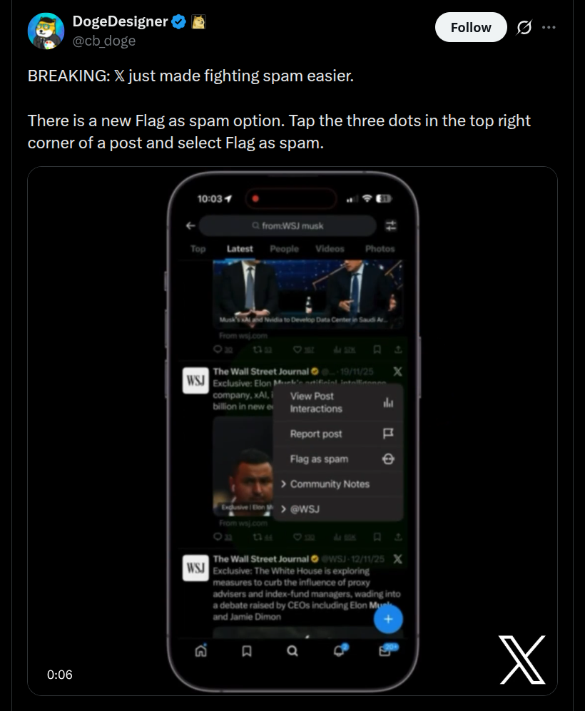 About the ‘Flag as Spam’ option, X users can easily report and flag a content which appears to be a spam by tapping on the three dots icon at the top-right corner of a post, and then click on ‘Flag as spam’. You may check out these new features in action on the videos shared below.