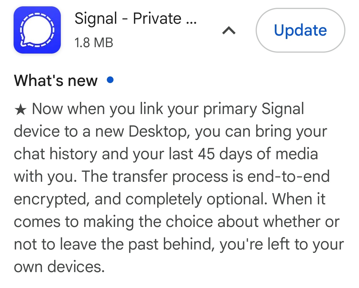 As per the new update now when you link your primary Signal device to a new Desktop or iPad, you can bring your chat history and your last 45 days of media with you. It is also specified that the transfer process is end-to-end encrypted and completely optional.