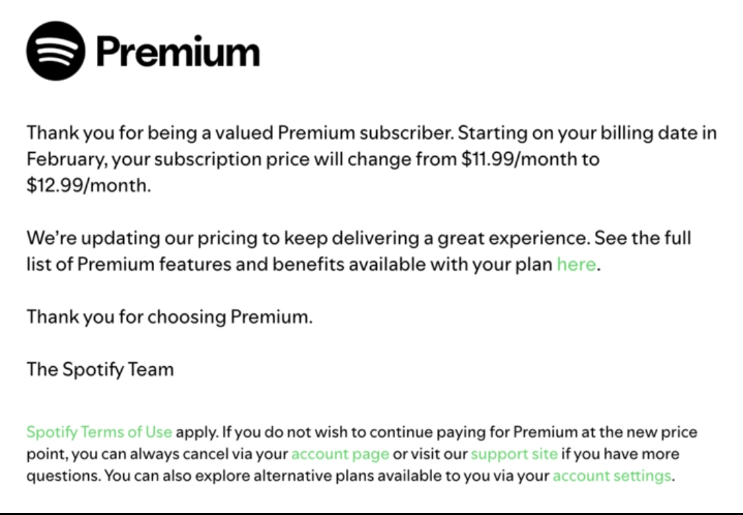 Starting the billing date in February, the Premium subscription (Individual) will change from $11.99 per month to $12.99 per month in the US, Estonia, and Latvia markets. The Premium subscribers in these regions will receive the following email informing them about this update and what this update means for their subscriptions.