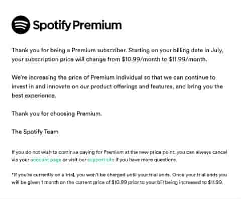 The email would look like the screen grab above. Although there has been an increase in the Individual, Duo, and Family plans, Spotify hasn’t changed the student subscription, which remains at $5.99.