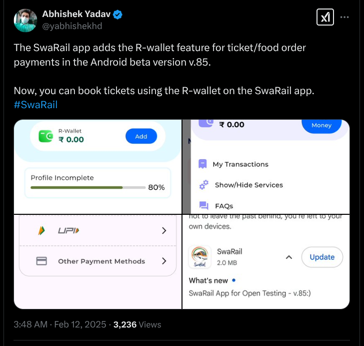 SwaRail App Brings New R-Wallet Feature for Ticket/Food Order Payments: In Android Beta v.85