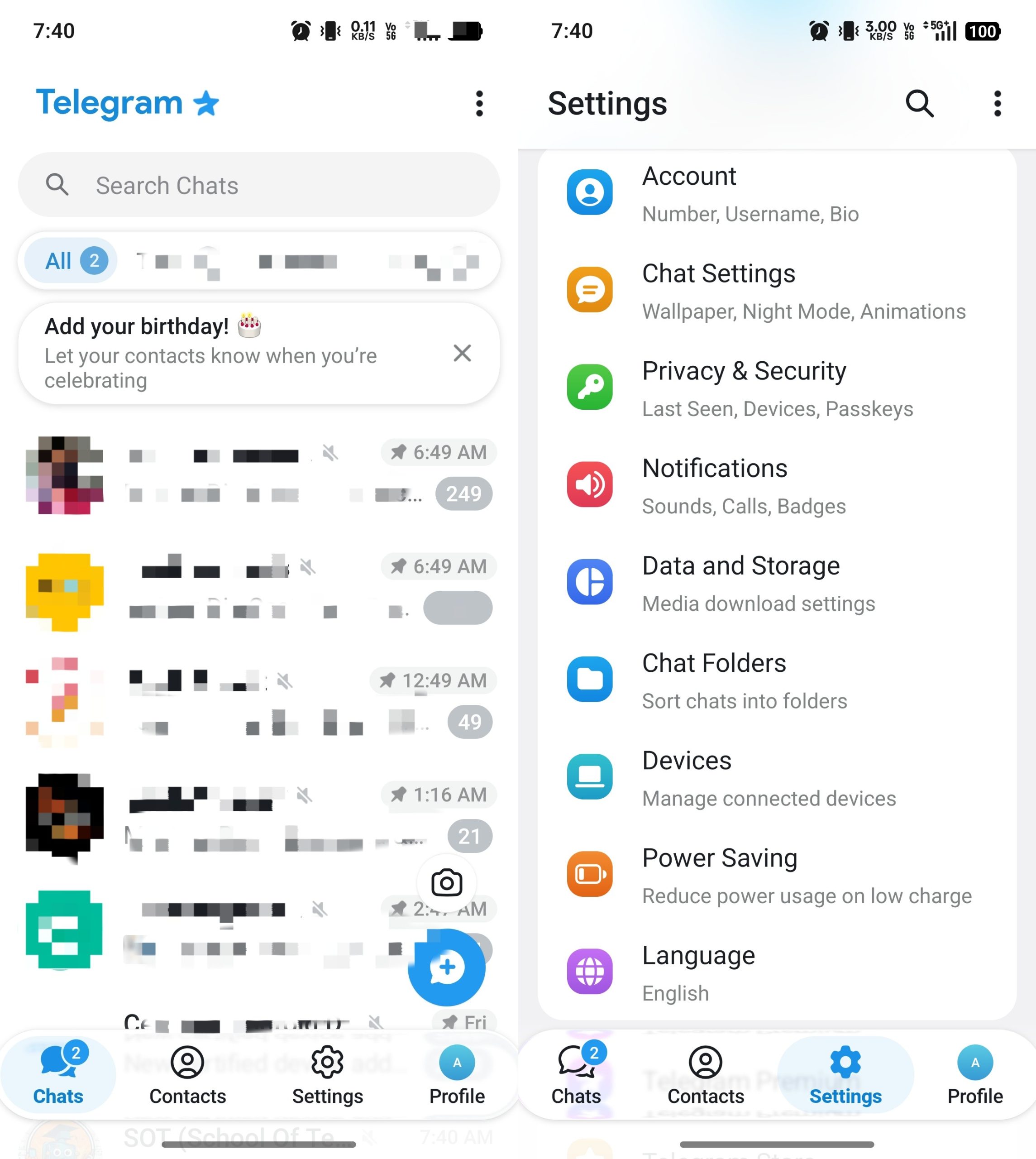 The “Search chats” option has become a full bar, replacing the search icon. Meanwhile, the hamburger menu has been shifted from left to right, probably for easier access. Telegram has tweaked the design of Settings with colour-coded icons, making the interface more visually streamlined. There is also a new Search icon that will help users easily find the required settings.