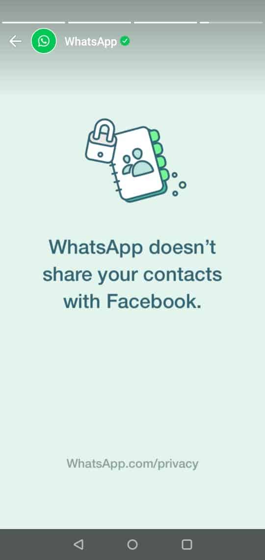 WhatsApp has recently added this in status for all users to inform them about its privacy policies WhatsApp is actually trying to be transparent to all its users to stop further damage that was being done after users didn’t like WhatsApp new privacy policies. WhatsApp has actually shown four statuses updates to all the users around it the first status status WhatsApp doesn’t share your contacts with Facebook, the second status reads WhatsApp can’t see your shared location third one WhatsApp is talking about that it’s privacy policy is that WhatsApp can’t read or listen to your personal conversations as they are protected by end to end encryption.