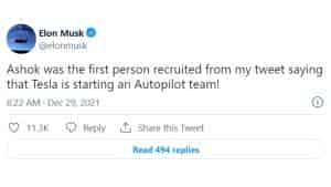 “Ashok was the first person recruited from my tweet saying that Tesla is starting an Autopilot team!“ Musk tweeted on December 29, responding to a Twitter excerpt from one of his interviews.