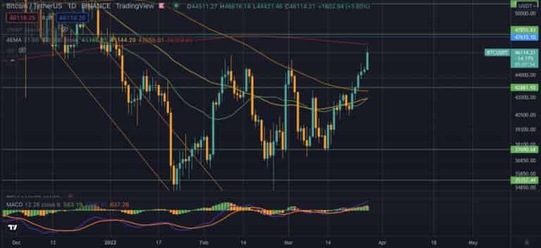 Bitcoin has just reached its highest level since January 4th, resulting in a weekly close above $45,500 for the first time in 2022. The move is a bullish indicator because BTC has broken through the $44,500 resistance level, which has already been rejected three times this year.
