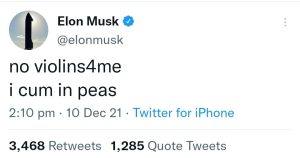 Elon Musk himself replied to his latest tweet, “no violins4me i cum in peas”