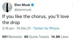 After just six minutes of this tweet, Elon Musk made another tweet which riddled the fans further. Musk stated, “If you like the chorus, you’ll love the drop.”