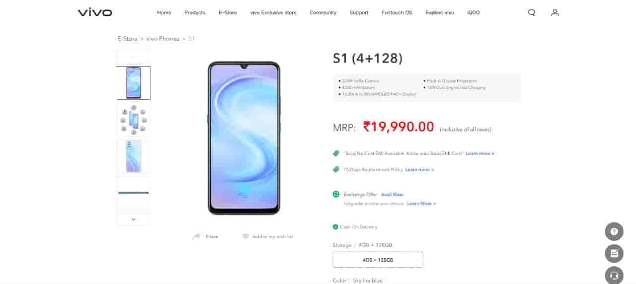 The price of the VIVO S1 phone is INR 19,990 on VIVO India’s official website. This price is inclusive of all taxes.