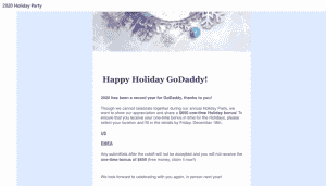 Around two weeks ago GoDaddy Emailed its employees offering a holiday bonus. Specifically, around 500 employees of GoDaddy received that email on December 14, 2020. The sender’s email address appeared as “[email protected]” as if the firm particularly created this email address for the offer.