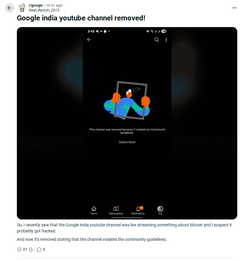 Speaking more, it was the YouTube channel for Google India that was hacked and a cryptocurrency promoting video was being streamed via the platform. Following this, the channel was removed from YouTube as it violated community guidelines and it is not active anymore. Moreover, many of the brand’s blogs and news posts that have been shared over the years are now filled with broken embeds as the source (Google India YouTube channel) has been removed.