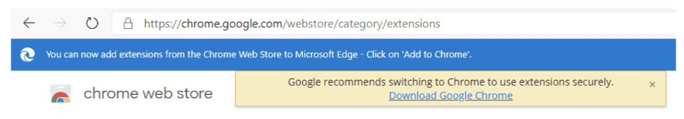 While this doesn’t prevent Edge users from adding Chrome extensions, the message is clearly designed to make them feel like their web browser is less secure than Chrome – something that we’ve not seen evidence of, especially as they both use the same underlying tech.