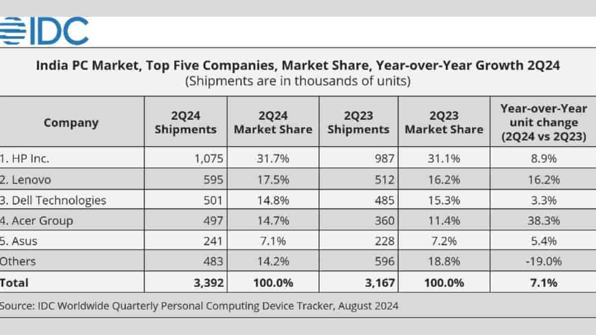 According to a recent report by International Data Corporation (IDC) Worldwide Quarterly Personal Computing Device Tracker, India’s PC market has shipped 3.39 million units in Q2 2024 with 7.1% YoY growth. The report also reveals the names of the top 5 companies in India’s PC market.