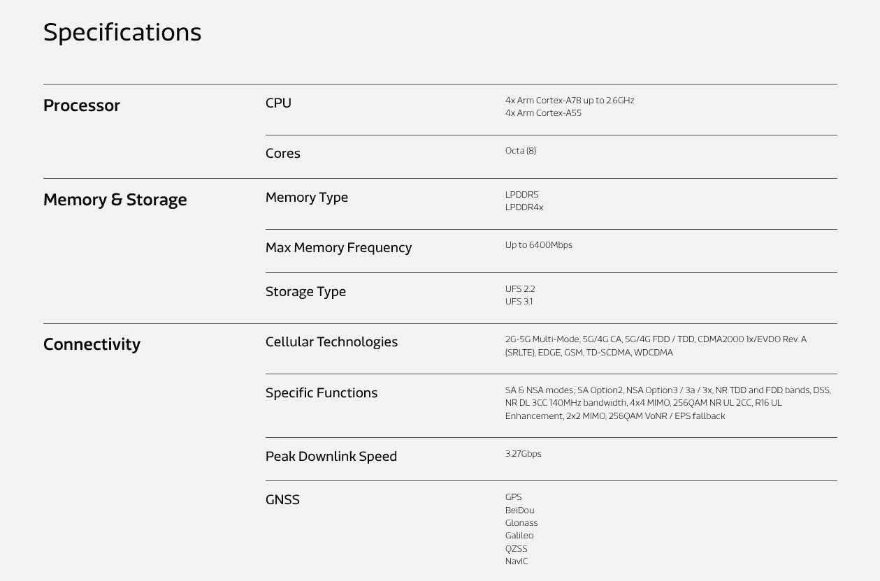 Speaking of their specs, they are octa-core processors equipped with four ARM Cortex A78 cores (clocked up to 2.6 GHz) and four ARM Cortex A55 cores. In terms of memory and storage, the two support LPDDR5 and LPDDR4x RAM types, with maximum memory frequency of up to 6400 Mbps. Storage type support includes UFS 2.2 and UFS 3.1.
