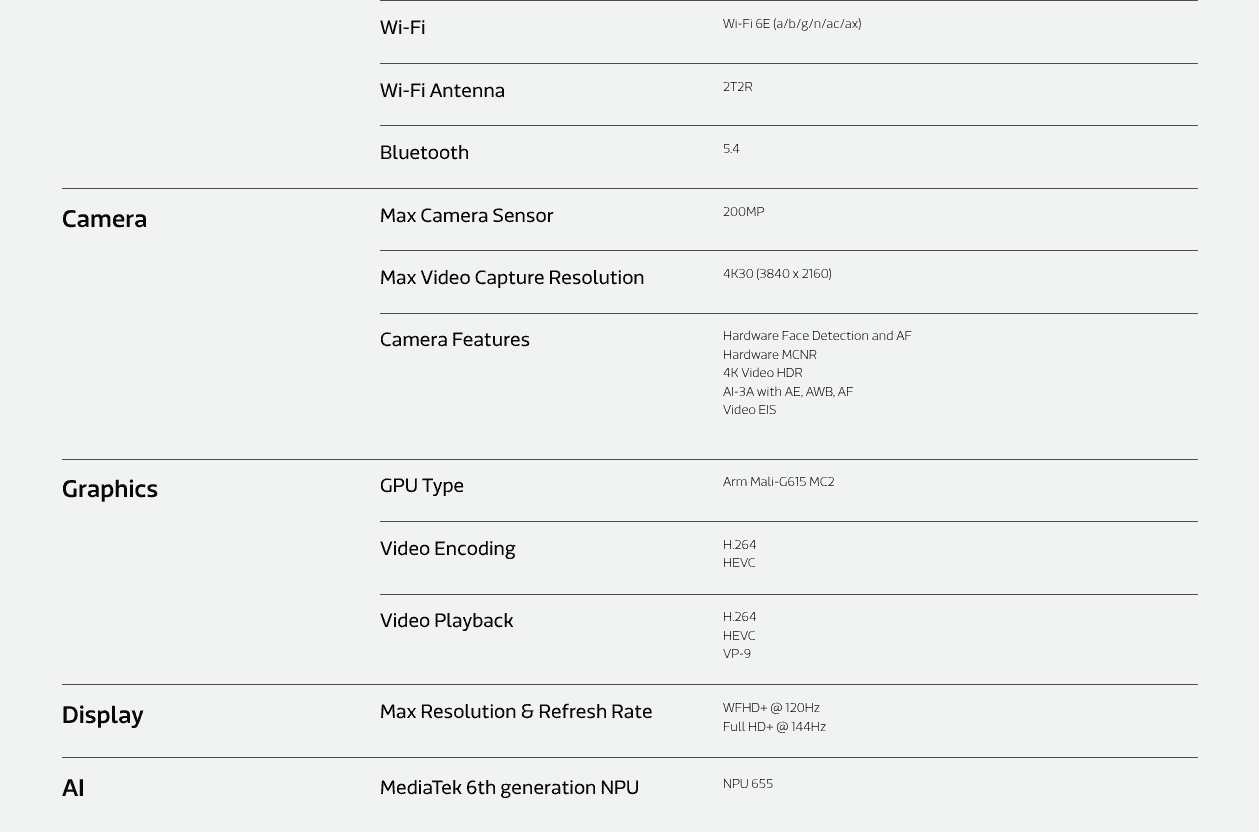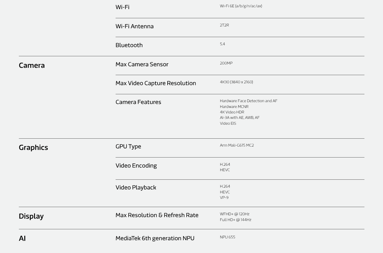 Finally about its graphics, display, and AI features, the ARM Mali-G615 MC2 GPU is integrated, providing H.264/HEVC video encoding and H.264/HEVC/VP-9 video playback. WFHD+ resolution display with 120Hz refresh rate and FHD+ display with 144Hz refresh rate are supported display screens. MediaTek’s 6th generation NPU 655 is also supported on the Dimensity 7400 and Dimensity 7400X chips.