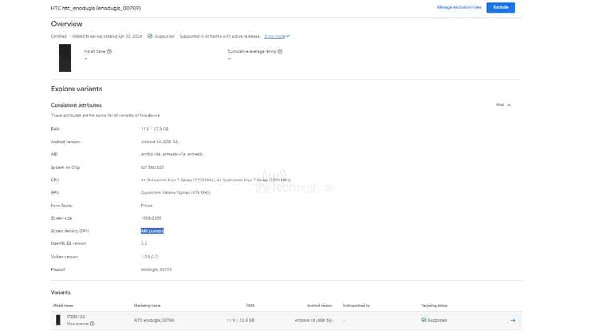 It seems HTC is still holding back on revealing the moniker, as it’s missing from the Google Play Console listing. However, key details about this upcoming smartphone has been revealed. The listing unveils that it will feature a chipset with the model number QTI SM7550, corresponding to the Snapdragon 7 Gen 3 SoC paired with a Qualcomm Adreno 7series GPU clocked at 676 MHz. It will boast 4 cores running at 2.2 GHz and another 4 cores at 1.8 GHz. Additionally, it will come with Android 14 out of the box and pack 12GB of RAM.