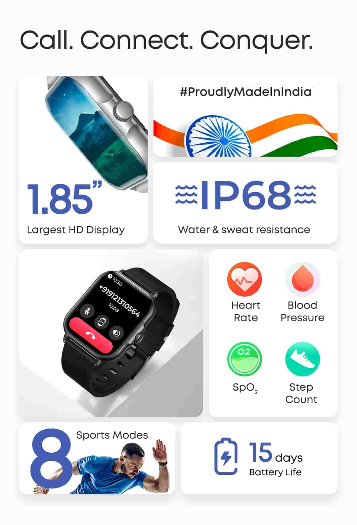 pTron’s Reflect Callz smartwatch features a 1.85-inch large HD display. Reflect Callz offers a battery life of about 15 days on standby mode. With daily usage, it offers a battery life of about 5 days.