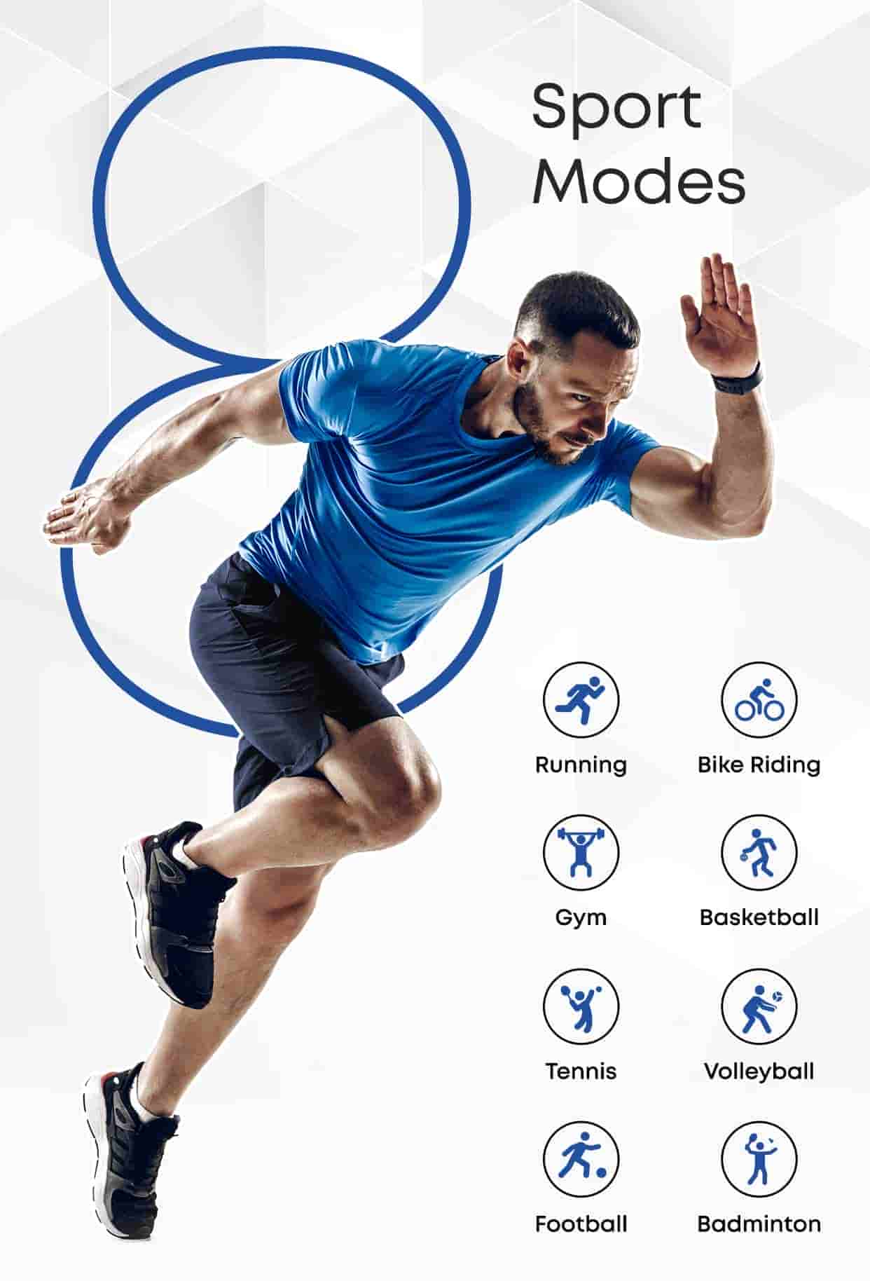 The watch features about 8 sports modes, which consist of modes such as Running, Bike Riding, Gym, Basketball, Tennis, Volleyball, Football, and Badminton.