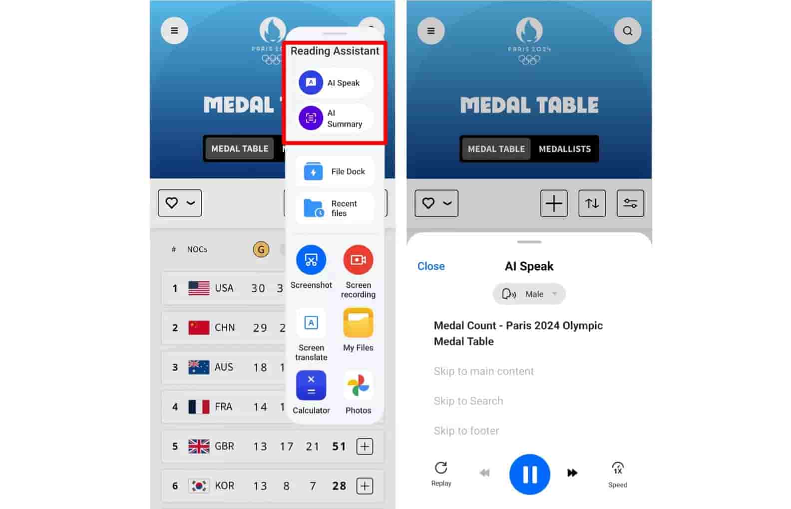 The AI Speak works with browsers and news apps. While using it you can select from male and female voice, use the replay function, switch sentences, and adjust playback speed.