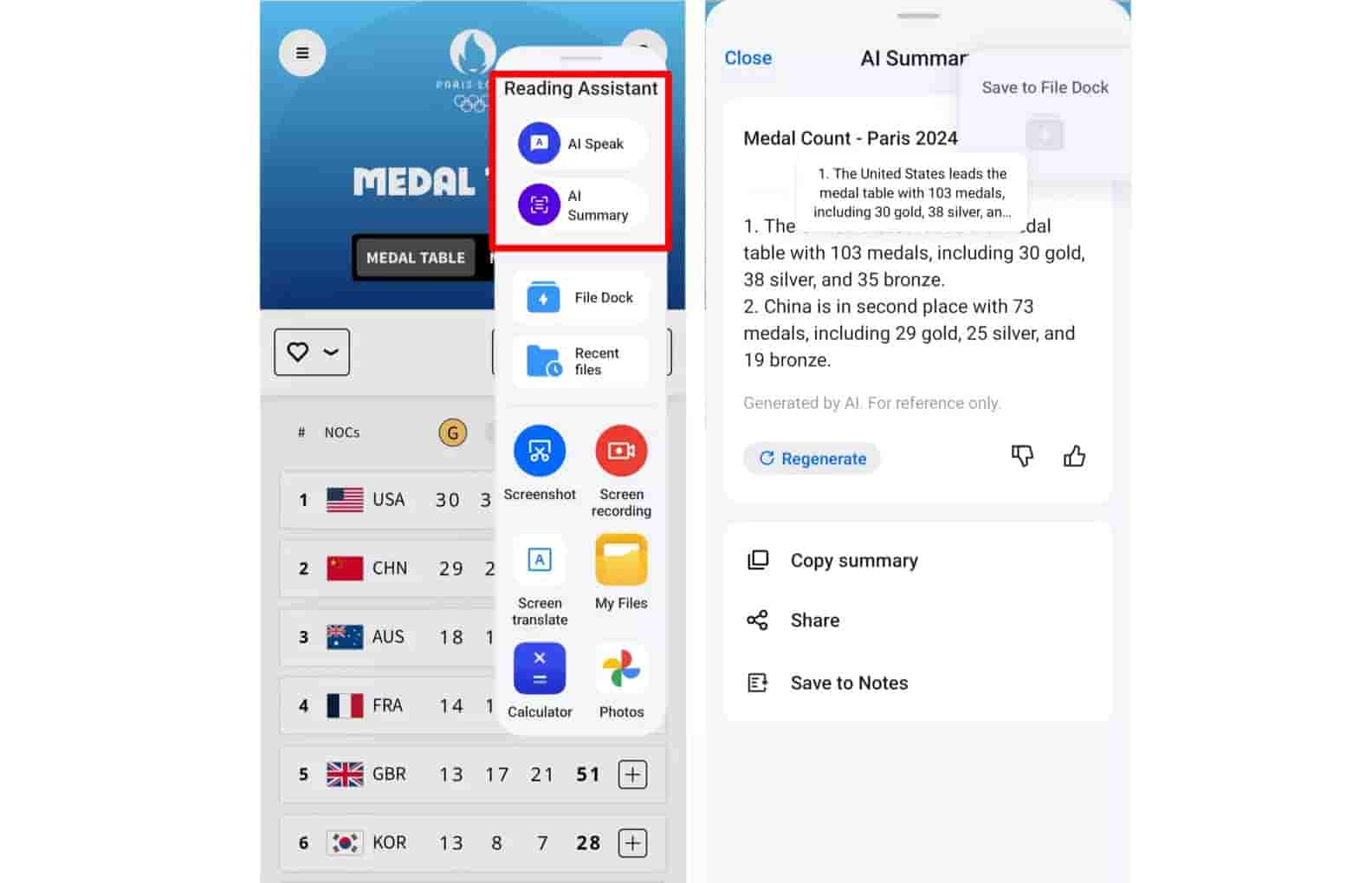 Suppose you are going through the scores of an Olympic competition and want a summary of that. You will access the AI Summary feature from the slide bar for this. The generated summary can be copied, shared, and saved. You can also save selected files to the file dock.