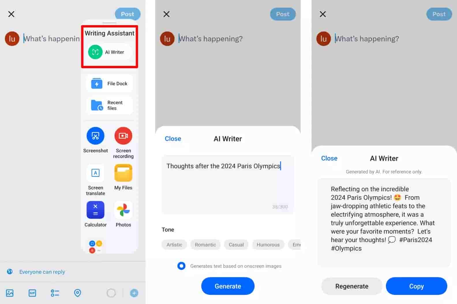 You will see this popping up on the sidebar under conditions like when social media is open, shopping apps, and email apps. You can write the prompt that can be regenerated and copied.