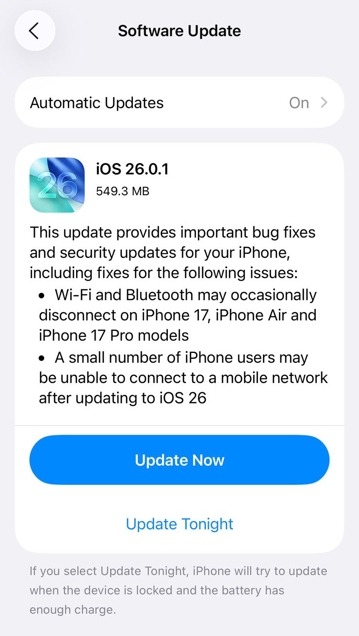 Speaking about the iOS 26.0.1 update, it has a total size of 549.3 MB and as its description, Apple has mentioned that the update will be providing bug fixes as well as security updates for iPhone devices. Two of the changelogs noted are the fix for WiFi and Bluetooth getting disconnected on the newly-released iPhone 17, iPhone 17 Pro, iPhone 17 Pro Max, and iPhone Air models. Also, for users who have been having issues connecting with mobile network following the iOS 26 update will be able to fix it after installing the iOS 26.0.1 update.